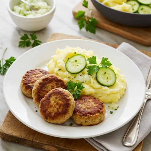 Faschierte Laibchen mit Kartoffeln und Gurkensalat